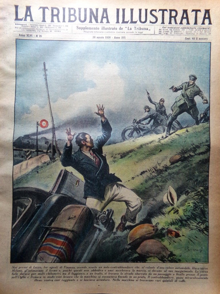 Nei pressi di Lecco, tre agenti di Finanza, avendo scorto un noto contrabbandiere che al volante d'una veloce automobile filava verso Milano, gl'intimavano il fermo e, poiché questi non ubbidiva e anzi accelerava la marcia, si davano al suo inseguimento. La corsa folle durava per molti chilometri, ma il fuggiasco, a un tratto, si trovava la strada sbarrata da un passaggio a livello presso il ponte sull'Oglio e frenava in modo così brusco che la macchina si rovesciava finendo in un prato. Il contrabbandiere, quasi miracolosamente illeso, veniva così raggiunto e si lasciava arrestare. Nella macchina si trovavano vari quintali di caffè (disegno di Vittorio Pisani)