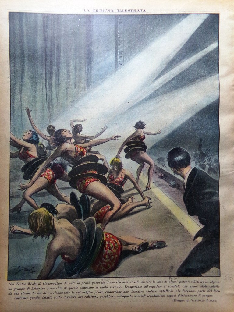 Nel teatro reale di Copenaghen, duerante la prova generale d'una sfarzosa rivista, mentre la luce di alcuni potenti riflettori avvolgeva un gruppo di ballerine, parecchie di queste cadevano al suolo svenute. Trasportate all'ospedale si constatò che erano state colpite da una strana forma di avvelenamento la cui origine prima risalirebbe alle bizzarre cinture metalliche che facevano parte del loro costume: queste infatti sotto il calore dei riflettori avrebbero sviluppato speciali irradiazioni capaci di intossicare il sangue (disegno di Vittorio Pisani)