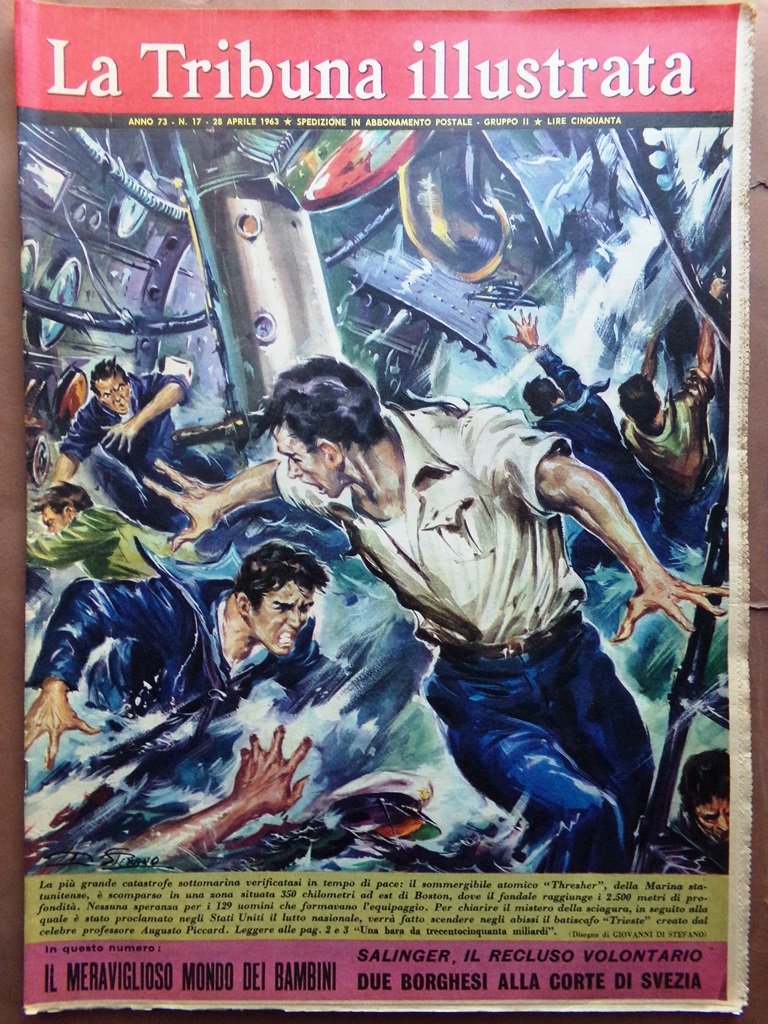 La più grande catastrofe sottomarina verificatosi in tempo di pace: il sommergibile atomico "Thresher" (SSN-593), della Marina statunitense è scomparso in una zona situata 350 chilometri ad est di Boston, dove il fondale raggiunge i 2.500 metri di profondità. Nessuna speranza per i 129 uomini che formavano l'equipaggio. Per chiarire il mistero della sciagura, in seguito alla quale è stato proclamato negli Stati Uniti il lutto nazionale, verrà fatto scendere negli abissi il batiscafo "Trieste" creato dal celebre professore Piccard (disegno di G. Di Stefano)