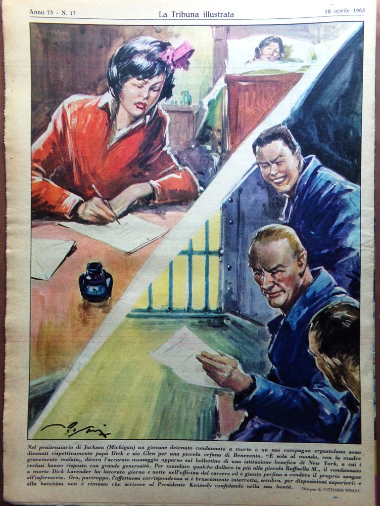 Nel penitenziario di Jackson (Michigan) un giovane detenuto condannato a morte e un suo compagno ergastolano sono divenuti rispettivametne papà Dick e zio Glen per una piccola orfana di Benevento. "È sola al mondo, con la madre gravemente malata" diceva l'accorato messaggio apparso sul bollettino di una istituzione benefica di New York, a cui i reclusi hanno risposto con grande generosità. Per mandare qualche dollaro in più alla piccola Raffaella M., il condannato a morte Dick Lavender ha lavorato giorno e notte nell'officina del carcere ed è giunto perfino a vendere il proprio sangue all'infermeria. Ora, purtroppo, l'affettuosa corrispondenza si è bruscamente interrotta, sembra, per disposizioni superiori: e alla bambina non è rimasto che scrivere al presidente Kennedy confidando nella sua bontà (disegno di Vittorio Pisani)