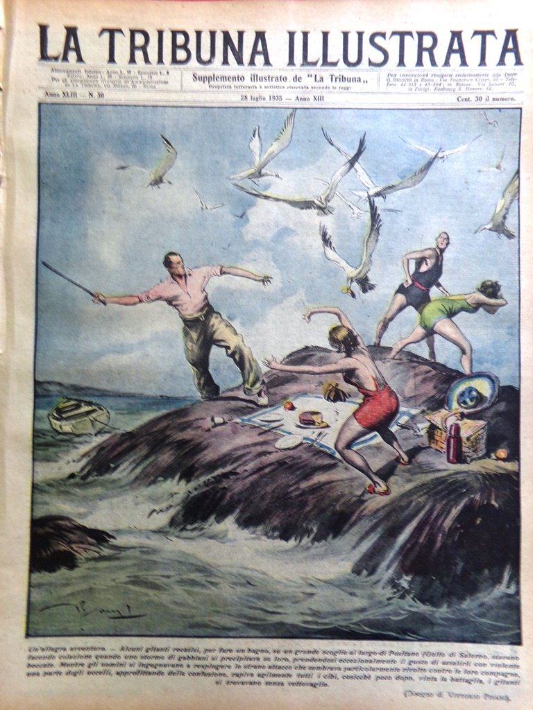 Alcuni gitanti recatisi, per fare un bagno, su un grande scoglio al largo di Positano (Golfo di Salerno), stavano facendo colazione quando uno stormo di gabbiani si precipitava su loro, prendendosi eccezionalmente il gusto di assalirli con violente beccate. Mentre gli uomini si impegnavano a respingere lo strano attacco che sembrava particolarmente rivolto contro le loro compagne, una parte degli uccelli, approfittando della confusione, rapiva agilmente tutti i cibi, cosicchè poco dopo, vinta la battaglia, i gitanti si trovavano senza vettovaglie (disegno di Vittorio Pisani)