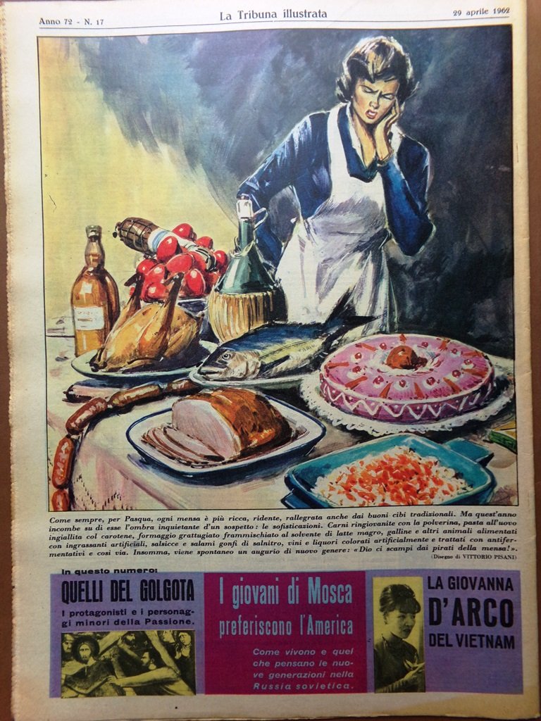 Come sempre, per Pasqua, ogni mensa è più ricca, ridente, rallegrata anceh dai buoni cibi tradizionali. ma quest'anno incombe su di esse l'iombra inquietante di un sospetto: le sofisticazioni (disegno di Vittorio Pisani)