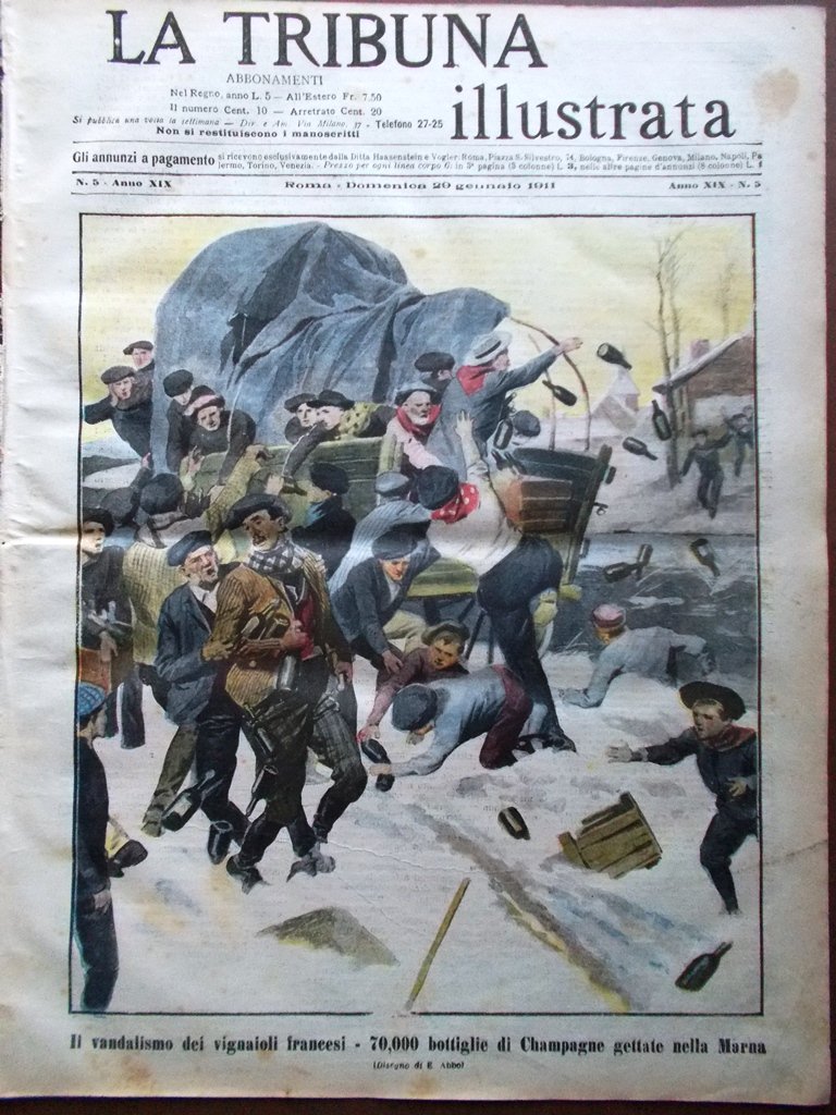 Il vandalismo dei vignaioli francesi - 70 mila bottiglie di Champagne gettate nella Marna (disegno di E. Abbo)