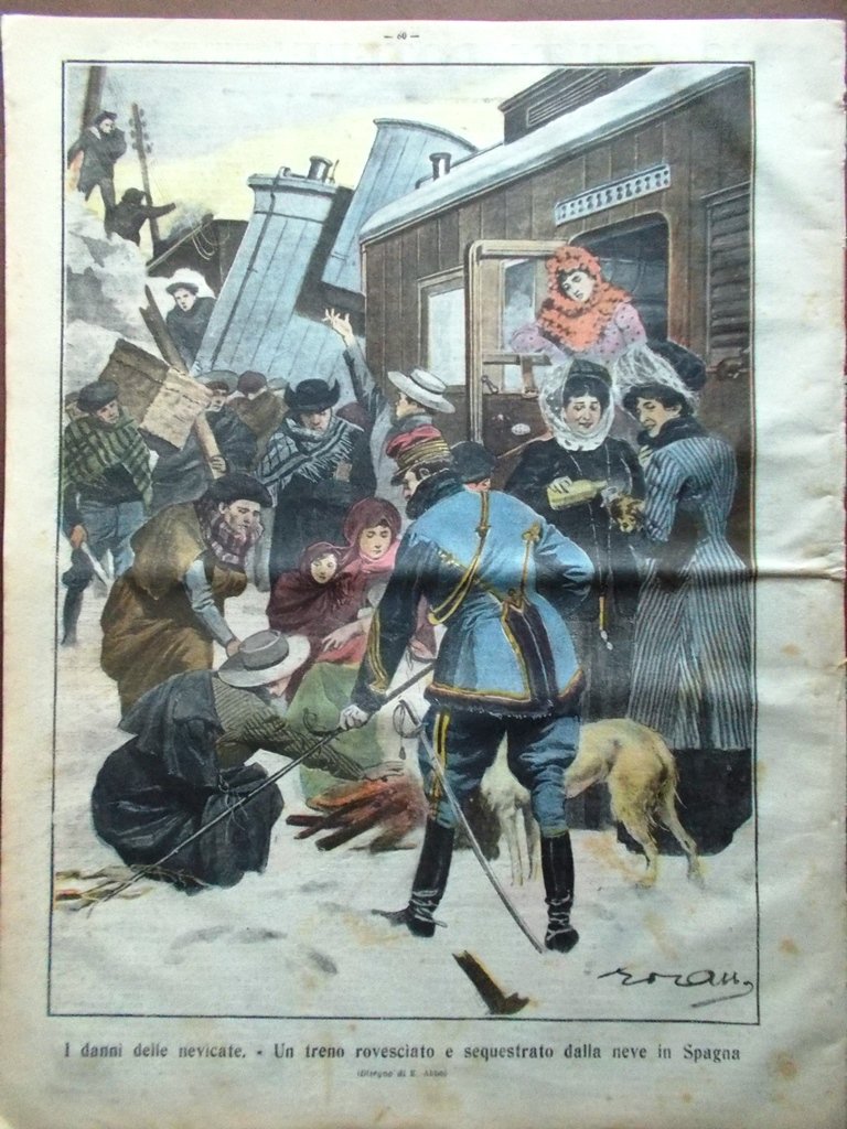 I danni delle nevicate - un treno rovesciato e sequestrato dalla neve in Spagna (disegno di E. Abbo)