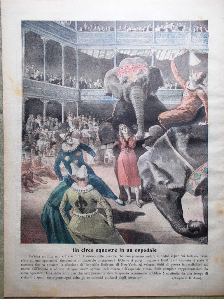 Un circo equestre in un ospedale: ai valorosi feriti impossibilitati ad uscire dall'istituto nell'ospedale Bellevue di New York, la direzione ha offerto comunque le rappresentazioni di un circo equestre (disegno di E. Abbo)