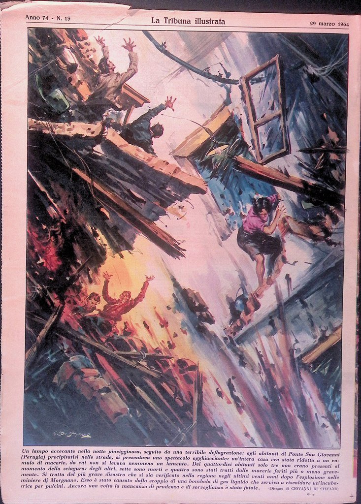 Un lampo accecante nella notte piovigginosa, seguito da una terribile deflagrazione: agli abitanti di Ponte San Giovanni (Perugia) precipitatisi nelle strade, si presentava uno spettacolo agghiacciante: un'intera casa era stata ridotta a un cumulo di macerie, da cui non si levava nemmeno un lamento. Dei quattordici abitanti solo tre non erano presenti al momento della sciagura: degli altri, sette sono morti e quattro sono stati tratti dalle macerie feriti più o meno gravemente. Si tratta del più grave disastro che si sia verificato nella regione negli ultimi venti anni dopo l'esplosione nelle miniere di Morgnano. Esso è stato causato dallo scoppio di una bombola di gas liquido che serviva a riscaldare un'incubatrice per pulcini. Ancora una volta la mancanza di prudenza e di sorveglianza è stata fatale.