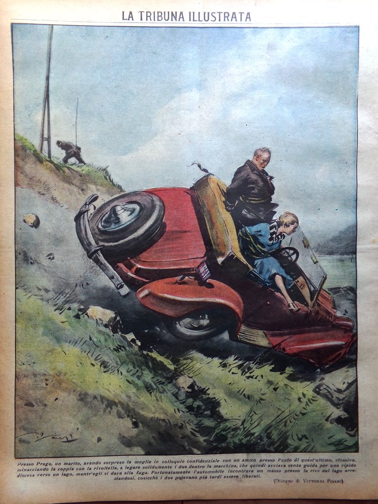 Presso Praga un marito avendo sorpreso la moglie in colloquio confidenziale con un amico presso l'auto di quest'ultimo, riusciva, minacciando la coppia con la rivoltella, a legare solidamente i due dentro la macchina, che quindi avviava senza guida per una ripida discesa verso un lago, mentr'egli si dava alla fuga. Fortunatamente l'automobile incontrava un masso presso la riva del lago arrestandosi, cosicché i due potevano più tardi essere liberati (disegno di Vittorio Pisani)