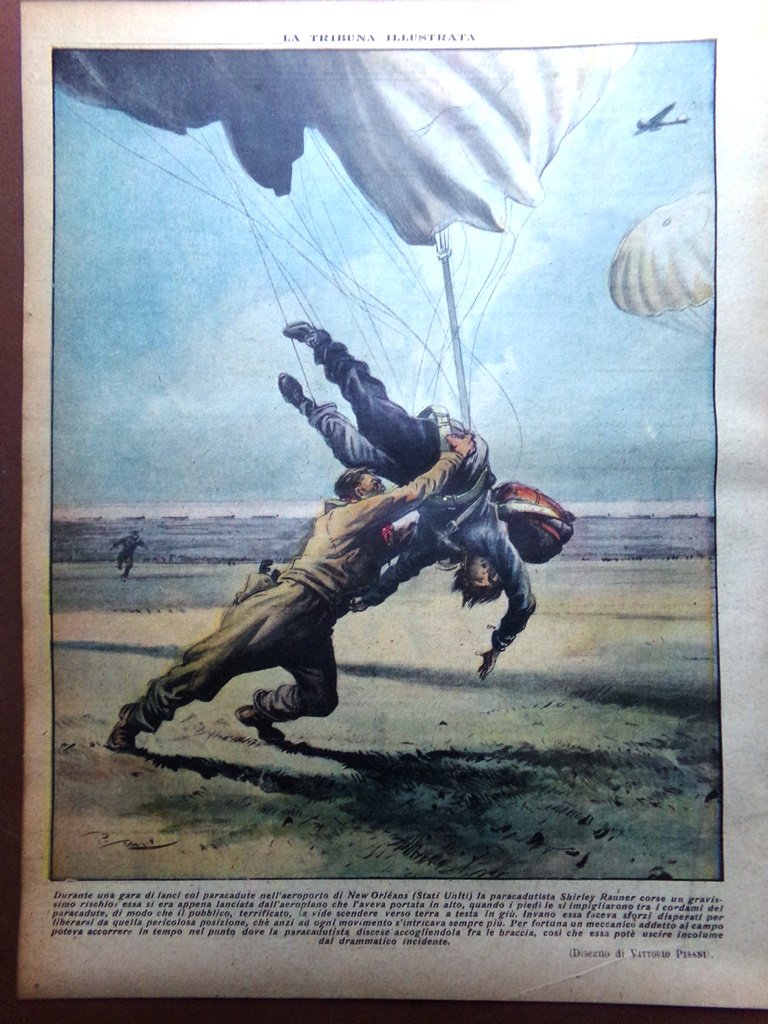 Durante una gara di lanci col paracadute nell'aeroporto di New Orleans (Stati Uniti) la paracadutista Shirley Rauner corse un gravissimo rischio: essa si era appena lanciata dall'aeroplano che l'aveva portata in alto, quando i piedi le si impigliarono tra i cordami del paracadute, di modo che il pubblico, terrificato, la vide scendere verso terra a testa in giù. Invano essa faceva sforzi disperati per liberarsi da quella pericolosa posizione, chè anzi ad ogni movimento s'intricava sempre più. Per fortuna un meccanico addetto al campo poteva accorrere in tempo nel punto dove la paracadutista discese accogliendola fra le braccia, così che essa potè uscire incolume dal drammatico incidente (disegno di Vittorio Pisani)