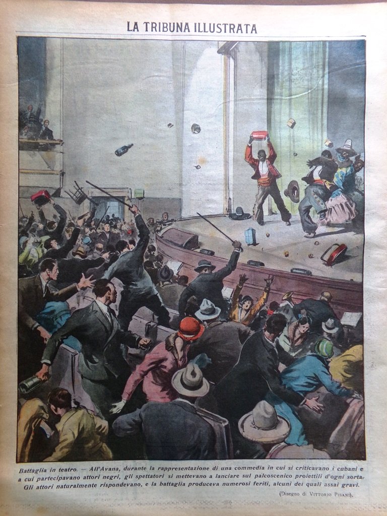 All'Avana durante la rappresentazione di una commedia in cui si criticavano i cubani e a cui partecipavano attori neri, gli spettatori si mettevano a lanciare sul palcoscenico proiettili d'ogni sorta. Gli attori naturalmente rispondevano, e la battaglia produceva numerosi feriti, alcuni dei quali assai gravi (disegno di Vittorio Pisani)
