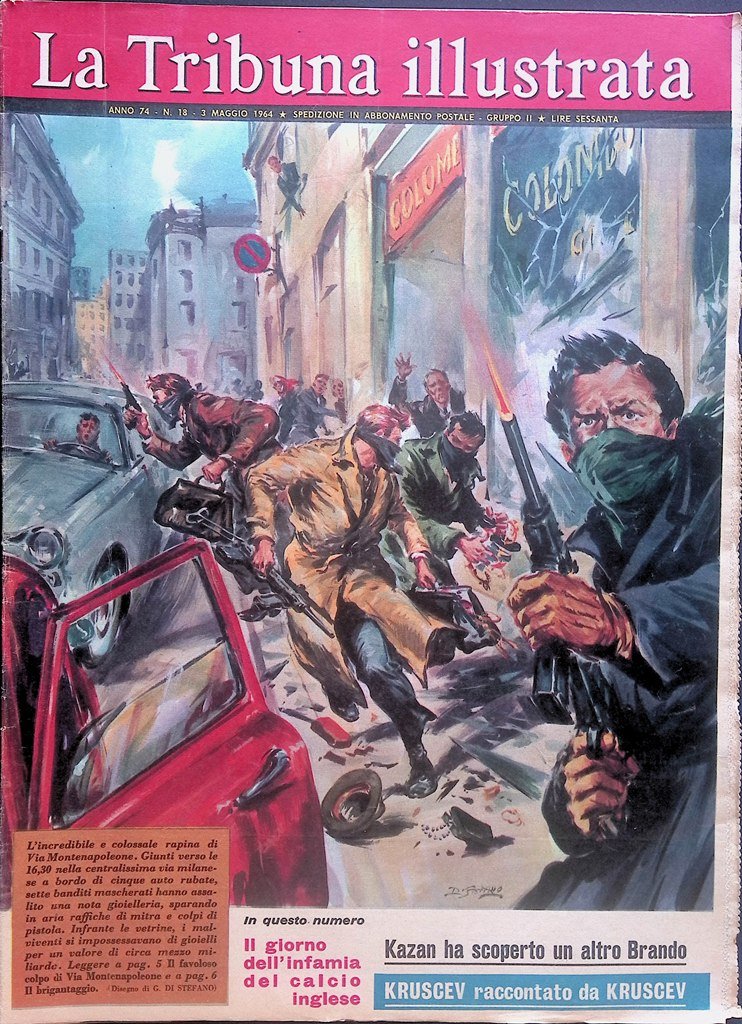 L'incredibile e colossale rapina di Via Montenapoleone. Giunti verso le 16,30 nella centralissima via milanese a bordo di cinque auto rubate, sette banditi mascherati hanno assalito una nota gioielleria, sparando in aria raffiche di mitra e colpi di pistola. Infrante le vetrine, i malviventi si impossessavano di gioielli per un valore di circa mezzo miliardo.