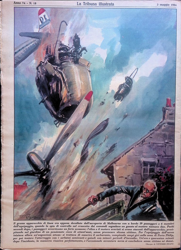 Il grosso apparecchio di linea era appena decollato dall'aeroporto di Melbourne con a bordo 59 passeggeri e 6 membri dell'equipaggio, quando la spia di controllo sul cruscotto dei comandi segnalava un guasto al motore numero due. Pochi secondi dopo, i passeggeri avvertivano un forte scossone: l'elica e il motore avariati si erano staccati dall'apparecchio, precipitando nel giardino di un pensionato cieco di ottant'anni, senza provocare alcuna vittima. Per l'equipaggio dell'aereo iniziava allora un'angosciosa attesa: si trattava di esaurire il carburante, compiendo ampi giri sulla zona di Porto Philip, per poi tentare l'atterraggio con i serbatoi semivuoti e quindi con minori pericoli d'incendio. Un'ora e quarantun minuti dopo l'incidente, la manovra riusciva perfettamente, e l'eccezionale avventura aerea si concludeva senza vittime né danni.