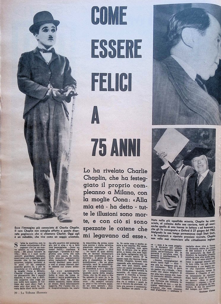 Come essere felici a 75 anni, lo ha rivelato Charlie Chaplin, che ha festeggiato il proprio compleanno a Milano, con la moglie Oona