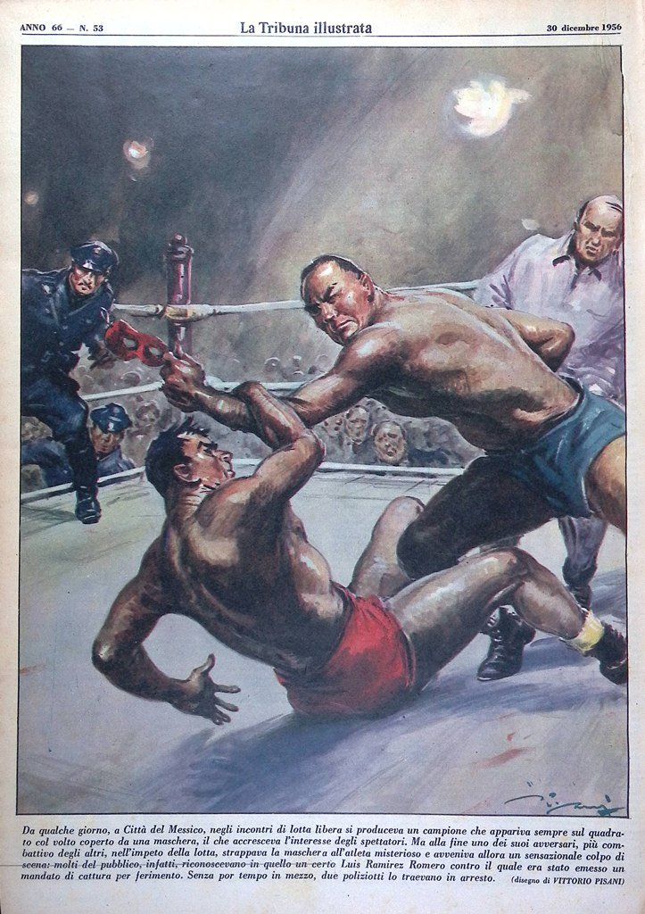 Da qualche giorno a Città del Messico, negli incontri di lotta libera si produceva un campione che appariva sempre sul quadrato col volto coperto da una maschera, il che accresceva l'interesse degli spettatori. Ma alla fine uno dei suoi avversari, più combattivo degli altri, nell'impeto della lotta, strappava la maschera all'atleta misterioso e avveniva allora un sensazionale colpo di scena; molti del pubblico, infatti, riconoscevano in quello un certo Luis Ramirez Romero contro il quale era stato emesso un mandato di cattura per ferimento. Senza por tempo in mezzo, due poliziotti lo traevano in arresto (disegno di Vittorio Pisani)