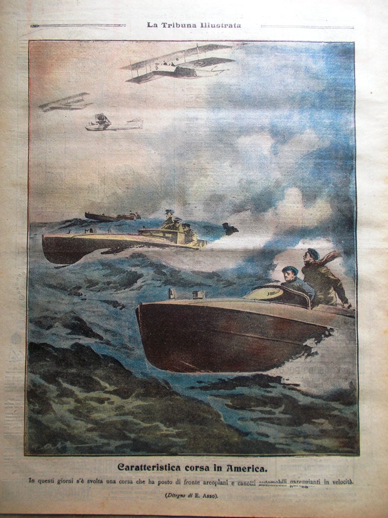 Caratteristica corsa in America fra aeroplani e canotti (disegno di E. Abbo)