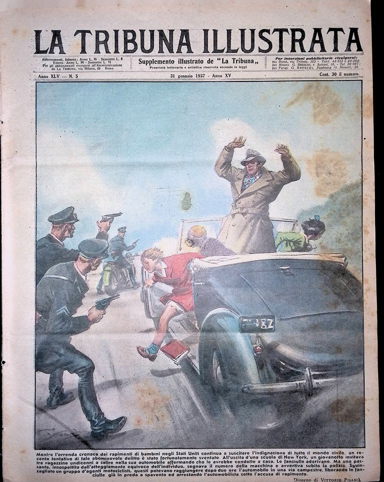 Mentre l'orrenda cronaca dei rapimenti di bambini negli Stati Uniti continua a suscitare l'indignazione di tutto il mondo civile, un recente tentativo di tale abominevole delitto è stato fortunatamente sventato. All'uscita di una scuola di New York, un giovanotto invitava tre ragazzine undicenni a salire nella sua automobile affermando che le avrebbe condotte a casa. Le fanciulle aderivano. Ma una passante, insospettita dall'atteggiamento equivoco dell'individuo, segnava il numero della macchina e avvertiva subito la polizia. Sguinzagliato un gruppo d'agenti motociclisti, questi potevano raggiungere dopo due ore l'automobile in una via campestre, liberando le fanciulle già in preda a spavento e arrestando l'automobilista sotto l'accusa di rapimento (disegno di Vittorio Pisani)