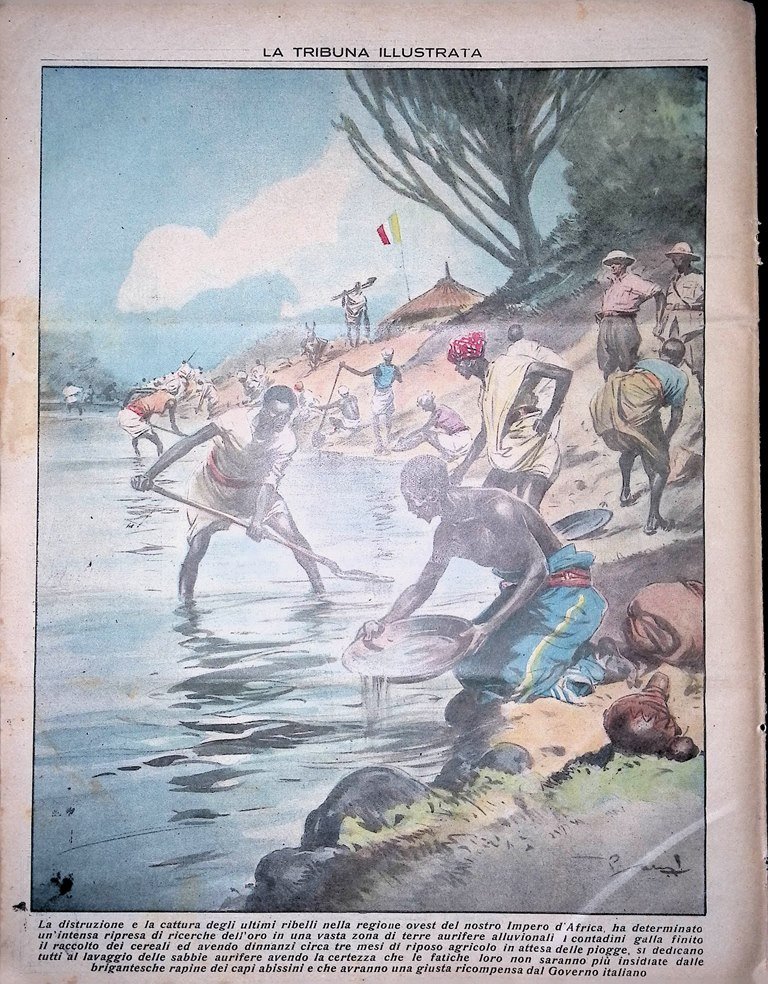 La distruzione e la cattura degli ultimi ribelli nella regione ovest del nostro Impero d'Africa ha determinato un'intensa ripresa di ricerche dell'oro in una vasta zona di terre aurifere alluvionali. I contadini galla finito il raccolto dei cereali ed avendo dinnanzi circa tre mesi di riposo agricolo in attesa delle piogge, si dedicano tutti al lavaggio delle sabbie aurifere avendo la certezza che le fatiche loro non saranno più insidiate dalle brigantesche rapine dei capi abissini e che avranno una giusta ricompensa dal Governo Italiano (disegno di Vittorio Pisani)