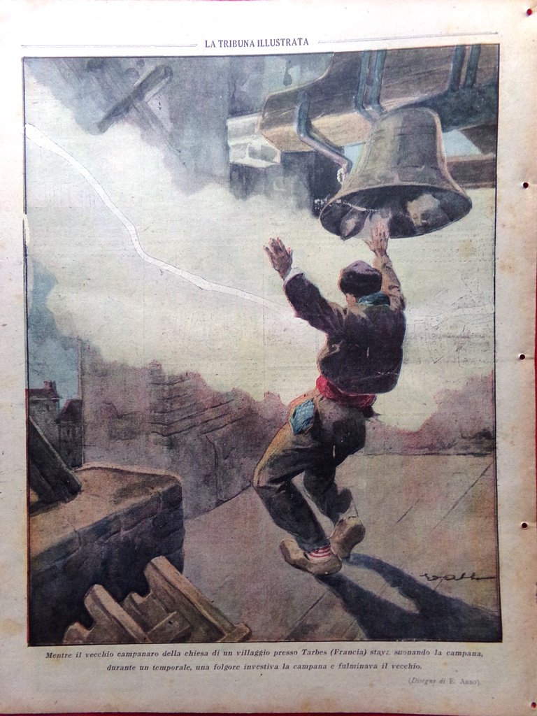 Mentre il vecchio campanaro della chiesa di un villaggio presso Tarbes (Francia) stava suonando la campana, durante un temporale, una folgore investiva la campana e fulminava il vecchio (disegno di E. Asso)