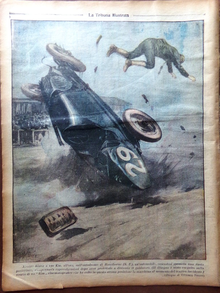 Mentre filava a 150 km all'ora, sull'autodromo di Hawthorne (S.U.) un'automobile, essendosi spezzata una ruota posteriore, si impennava capovolgendosi dopo aver proiettato a distanza il guidatore (disegno di Vittorio Pisani)