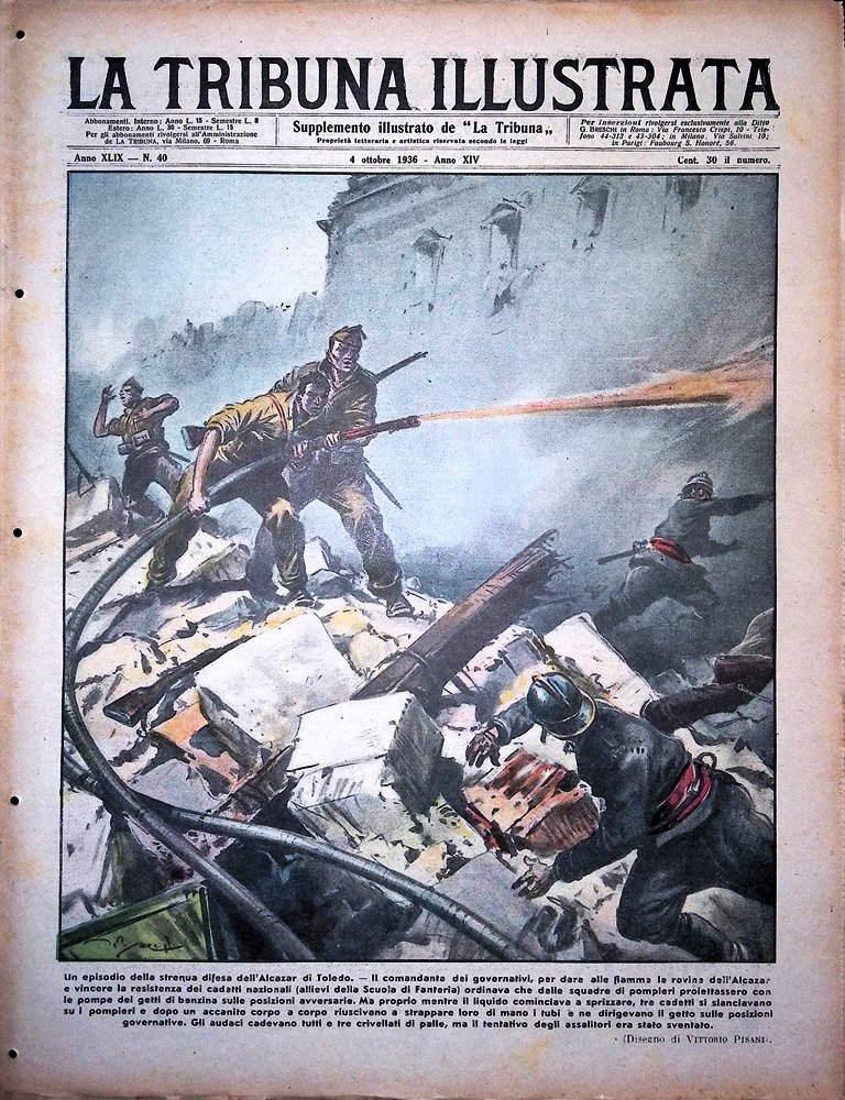 Il comandante dei governativi per dare alle fiamme le rovine dell'Alcazar di Toledo e vincere la resistenza dei cadetti nazionali ordinava che delle squadre di pompieri proiettassero con le pompe getti di benzina sulle posizioni avversarie. Ma mentre il liquodi cominciava a spruzzare, tre cadetti si slanciavano sui pompieri e riuscivano a strappargli i tubi di mano dirigendo il getto sulle posizioni governative. Morivano tutti e tre ma il tentativo era stato sventato (disegno di Vittorio Pisani)