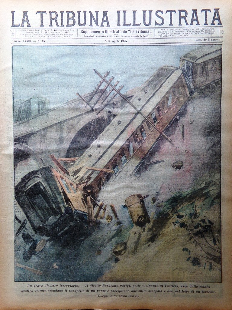 Un grave disastro ferroviario: il diretto Bordeaux-Parigi, nelle vicinanze di Poitiers, esce dalle rotaie e quattro vetture sfondano il parapetto di un ponte precipitando dal burrona (disegno di Vittorio Pisani)