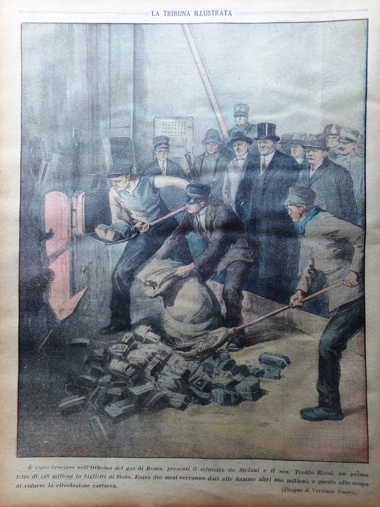 Bruciato nell'officina del gas di Roma un lotto di 128 milioni in biglietti di Stato per ridurre la circolazione cartacea (disegno di Vittorio Pisani)