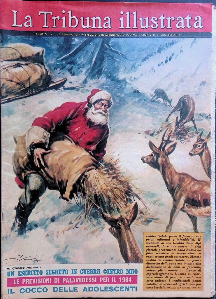 Babbo Natale porta il fieno ai caprioli affamati e infreddoliti. È accaduto in una località delle Alpi orientali, dove una massa di aria glaciale proveniente dalla Russia ha fatto scendere la temperatura a venti-trenta gradi sottozero. Mentre vestito da Babbo Natale, un guardiacaccia della zona era intendo alla distribuzione di doni ai fanciulli, notava più a monte un branco di caprioli affamati. L'uomo si riforniva allora di fieno, e avendo ancora indosso i tradizionali panni natalizi, si recava ad offrirlo alle povere bestiole