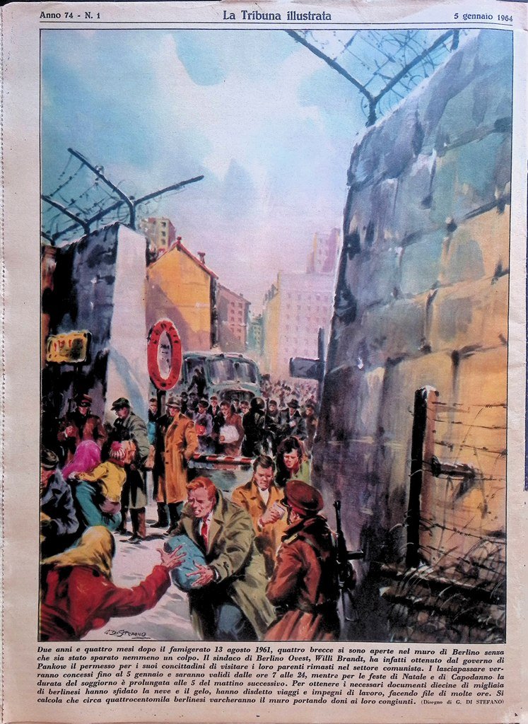 Due anni e quattro mesi dopo il famigerato 13 agosto 1961, quattro brecce si sono aperte nel muro di Berlino senza che sia stato sparato nemmeno un colpo. Il sindaco di Berlino Ovest, Willi Brandt, ha infatti ottenuto dal governo di Pankow il permesso per i suoi concittadini di visitare i loro parenti rimasti nel settore comunista. i lasciapassare verranno concessi fino al 5 gennaio e saranno validi dalle ore 7 alle 24, mentre per le feste di Natale di Capodanno la durata del soggiorno è prolungata alle 5 del mattino successivo. Per ottenere i necessari documenti decine di migliaia di berlinesi hanno sfidato la neve e il gelo, hanno disdetto viaggi e impegni di lavoro, facendo file di molte ore. Si calcola che circa 400.000 berlinesi varcheranno il muro portando doni e i loro congiunti.