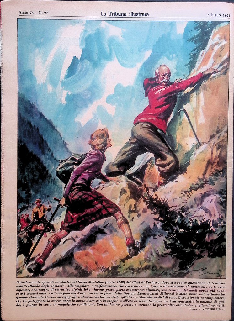 Entusiasmante gara di vecchietti sul Sasso Mattolino (metri 1542) dei Pizzi di Perlasco, dove si è svolto quest'anno il tradizionale "collaudo degli anziani". Alla singolare manifestazione, che consiste in una "prova di resistenza al cammino, in terreno alpestre, non scevro di attrattive alpinistiche" hanno preso parte centotrenta alpinisti, una trentina dei quali aveva già superato i sessant'anni. Lo "scarponcino d'oro" messo in palio dalla Società Escursionisti Milanesi è stato vinto dal settantacinquenne Costante Croce, un tipografo milanese che lavora dalle 7,30 del mattino alle undici di sera. L'eccezionale arrampicatore, che ha festeggiato la scorso anno le nozze d'oro con la moglie e all'età di sessantacinque anni ha conseguito la patente di guida, è giunto in vetta in magnifiche condizioni. Con lui hanno portato a termine la prova altri ottantadue gagliardi nonnetti.