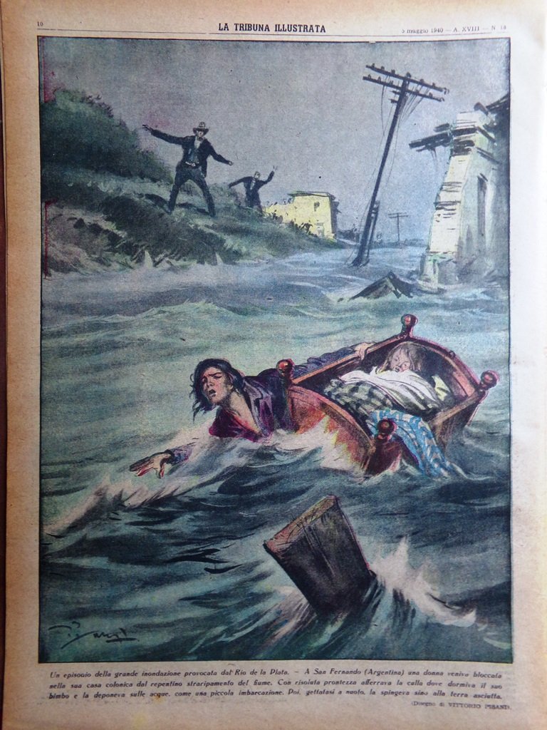 La grande inondazione del Rio de la Plata. A San Fernando (Argentina) una donna veniva bloccata nella sua casa colonica dal repentino straripamento del fiume. Con risoluta prontezza afferrava la culla dove dormiva il suo bimbo e la deponeva sulle acque come una piccola imbarcazione, spingendola poi fino alla terra asciutta (disegno di Vittorio Pisani)