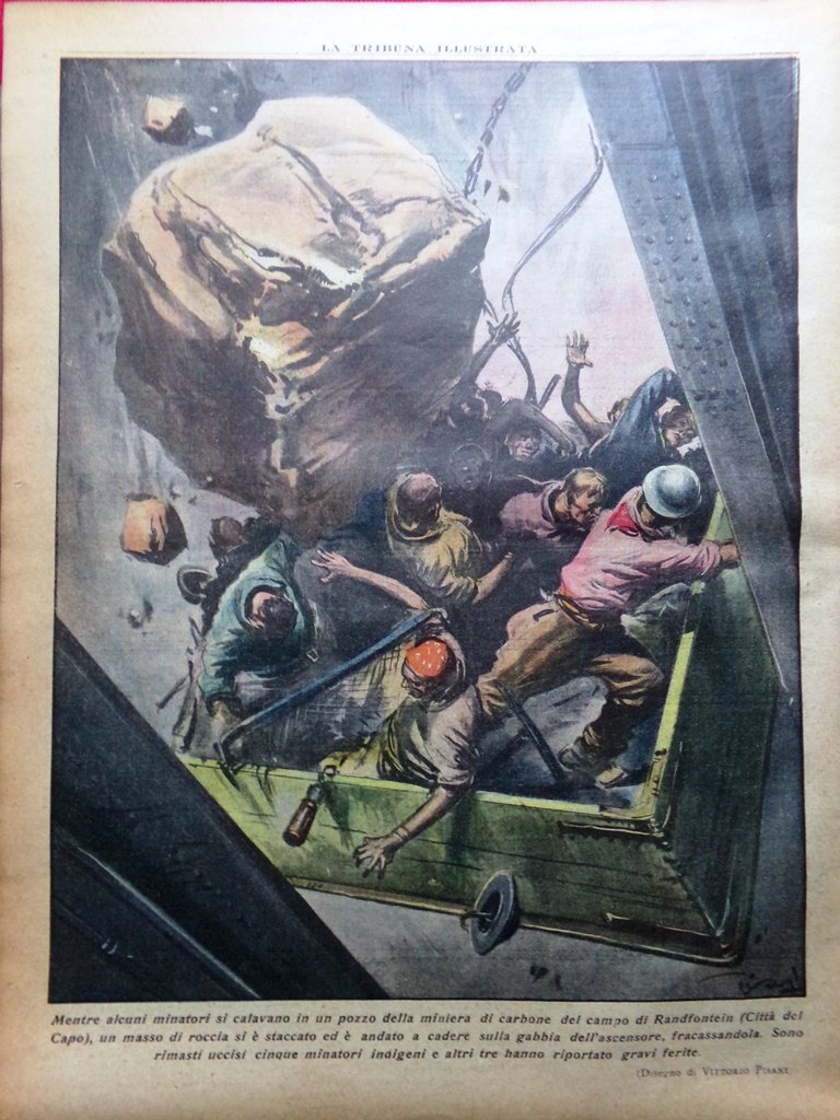 Mentre alcuni minatori si calavano in un pozzo della miniera di carbone del campo di Randfontein (Città del Capo), un masso di roccia si è staccato ed è andato a cadere sulla gabbia dell'ascensore, fracassandola. Sono rimasti uccisi cinque minatori indigeni e altri tre hanno riportato gravi ferite (disegno di Vittorio Pisani)
