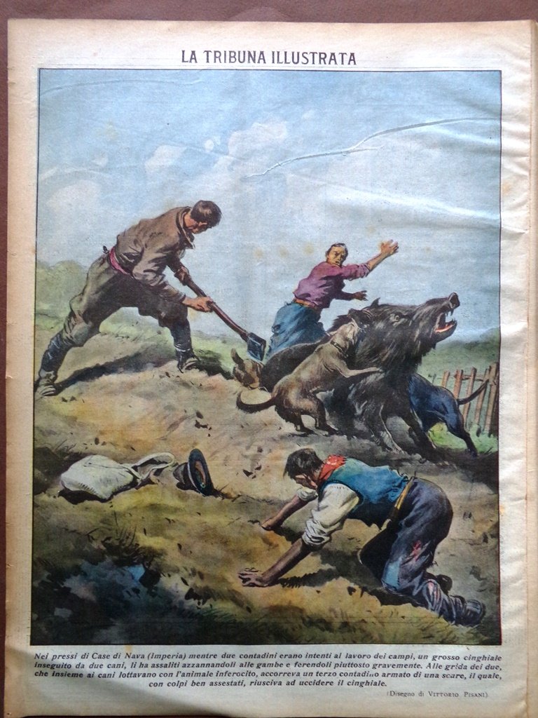 Nei pressi di Case di Nava (Imperia) mentre due contadini erano intenti al lavoro dei campi, un grosso cinghiale inseguito da due cani, li ha assaliti azzannandoli alle gambe e ferendoli piuttosto gravemente. Alle grida dei due che insieme ai cani lottavano con l'animale inferocito, accorreva un terzo contadino armato di una scure, il quale con colpi ben assestati, riusciva ad uccudere il cinghiale (disegno di Vittorio Pisani)