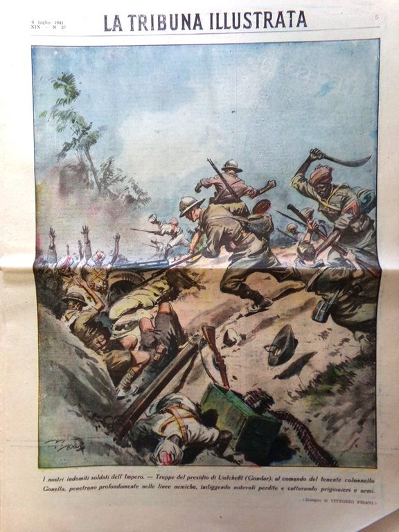 I nostri indomiti soldati dell'impero. Truppe del presidio di Uolchefit (Gondar), al comando del tenente colonnello Gonella, penetrano profondamente nelle linee nemiche, infliggendo notevoli perdite e catturando prigionieri e armi (disegno di Vittorio Pisani)