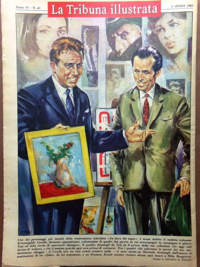 Uno dei personaggi più insoliti della trasmissione televisiva "La fiera dei sogni" è senza dubbio il tassista milanese Ermenegildo Covelli, divenuto appassionato collezionista di quadri dal giorno in cui accompagnò in campagna il pittore Tosi ed ebbe modo di osservarlo dipingere. Il quadro donatogli da Tosi fu il primo della sua collezione che oggi vale decine di milioni, e che il tassista guarda ogni sera prima di coricarsi. Tra i quadri che adornano le pareti del suo modestissimo alloggio il Covelli non ha mai voluto vendere nulla, vi sono anche un Morandi, donatogli dall'autore in sostituzione di un "falso" da lui acquistato, e un Fontana. Eccolo mentre mostra alcuni suoi tesori a Mike Bongiorno (disegno di G. Di Stefano)
