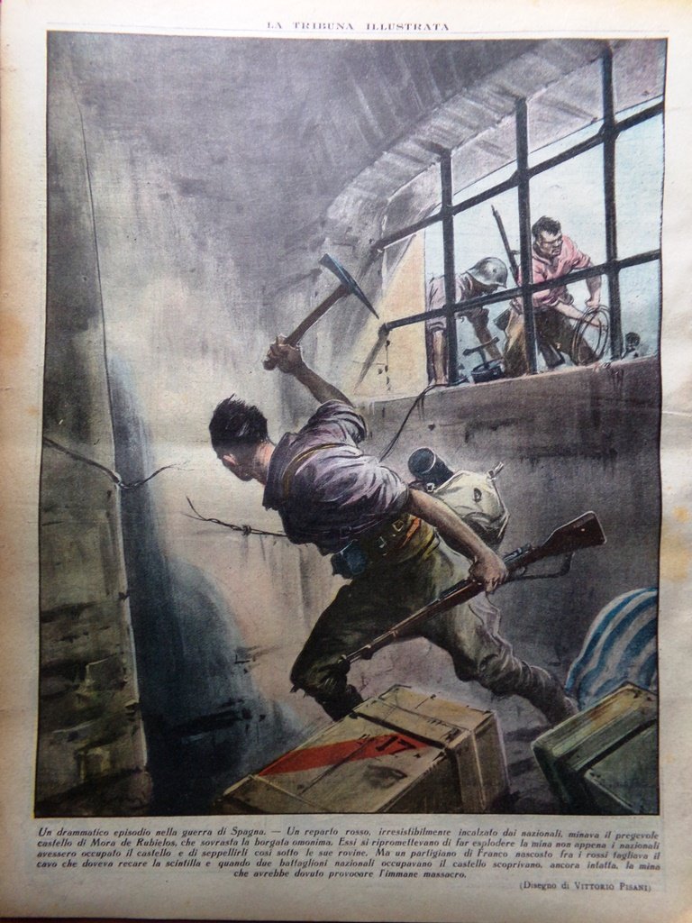 Un drammatico episodio nella guerra di Spagna. Un reparto rosso, irresistibilmente incalzato dai nazionali, minava il pregevole castello di Mora de Rubielos, che sovrasta la borgata omonima. Essi si ripromettevano di far esplodere la mina non appena i nazionali avessero occupato il castello e di seppellirli così sotto le sue rovine. Ma un partigiano di Franco nascosto fra i rossi tagliava il cavo che doveva recare la scintilla e quando due battaglioni nazionali occupavano il castello scoprivano, ancora intatta, la mina che avrebbe dovuto provocare l'immane massacro (disegno di Vittorio Pisani)