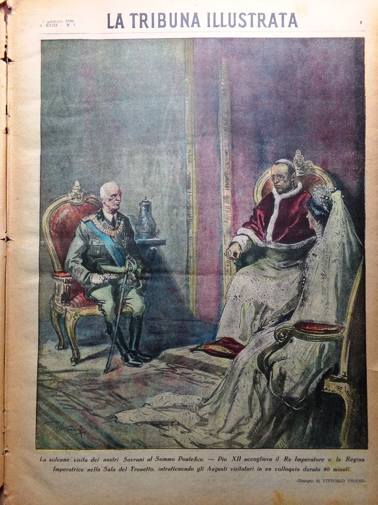 La solenne visita dei nostri sovrani al Sommo Pontefice: Pio XII accoglieva il re imperatore e la regina nella Sala del Tronetto (disegno di Vittorio Pisani)