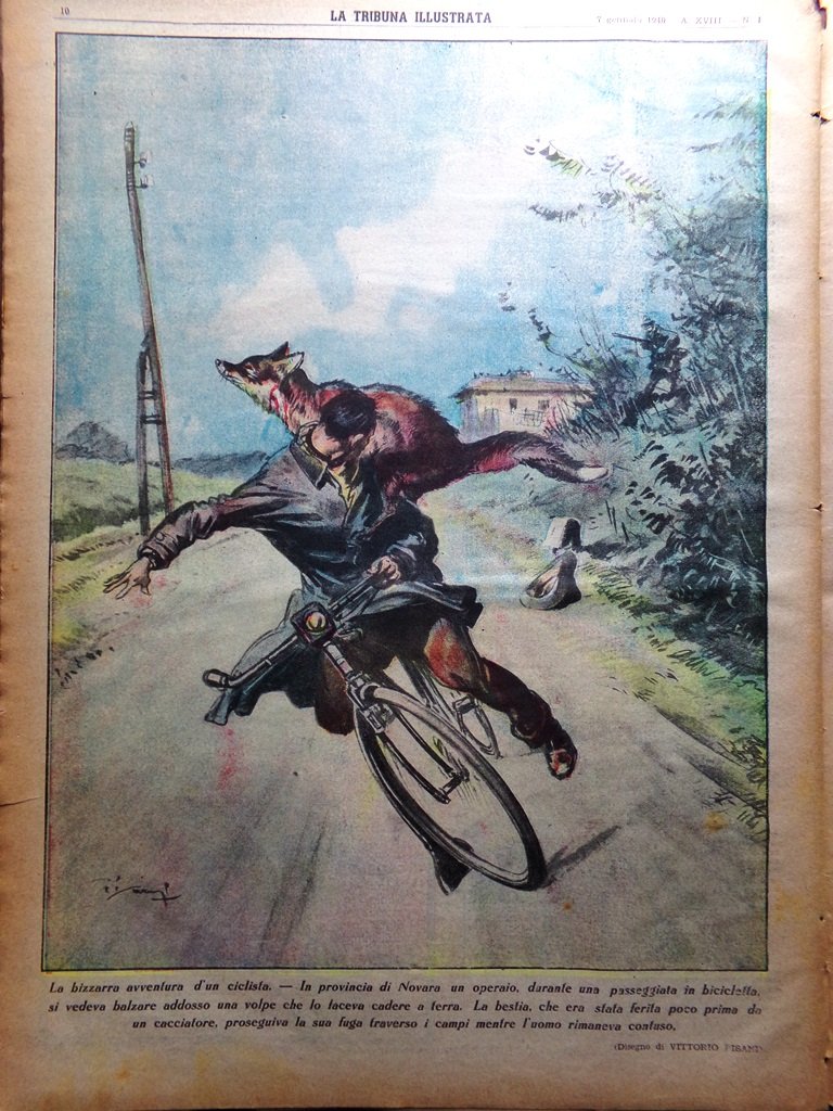 In provincia di Novara un operaio, durante una passeggiata in bicicletta, si vedeva balzare addosso una volpe che lo faceva cadere a terra. La bestia, che era stata ferita poco prima da un cacciatore, proseguiva la sua fuga attraverso i campi (disegno di Vittorio Pisani)