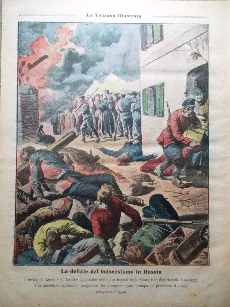 Le delizie del bolscevismo in Russia: i soviety di Lenin e di Trotsky agonizzano nell'antico impero degli zar (disegno di E. Abbo)
