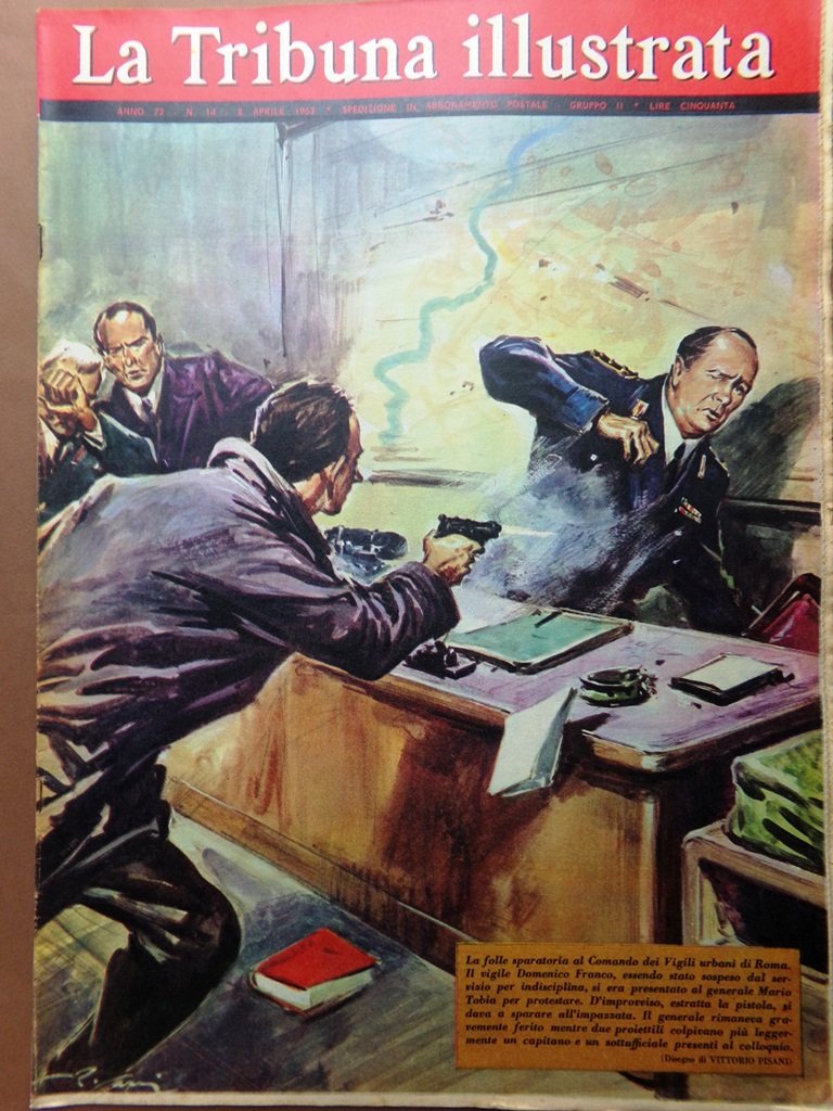 La folle sparatoria al Comando dei Vigili urbani di Roma. Il vigile Domenico Franco, essendo stato sospeso dal servizio per indisciplina, si era presentato al generale Mario Tobia per protestare. D'improvviso, estratta la pistola, si dava a sparare all'impazzata. Il generale rimaneva gravemente ferito mentre due proiettili colpivano più leggermente un capitano e un sottufficiale presenti al colloquio (disegno di Vittorio Pisani)