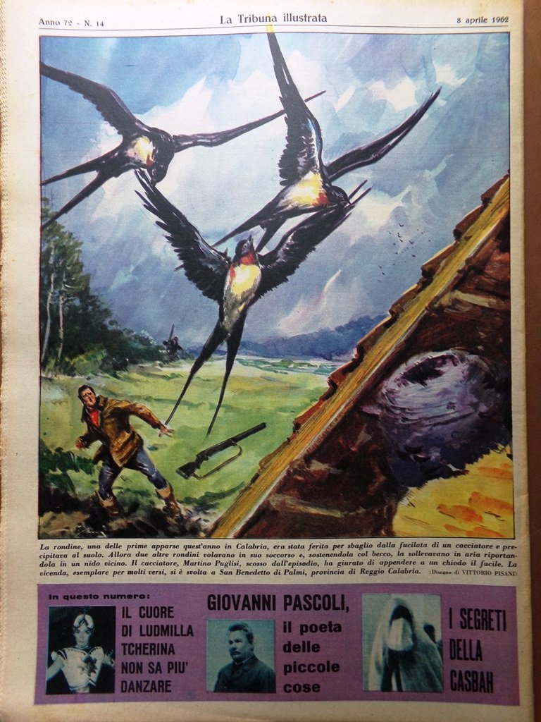 La rondine, una delle prime apparse quast'anno in Calabria, era stata ferita per sbaglio dalla fucilata di un cacciatore e precipitava al suolo. Allora due altre rondini volavano in suo soccorso e, sostenendola col becco, la sollevavano in aria riportandola in un nido vicino. Il cacciatore, Martino Puglisi, scosso dall'episodio, ha giurato di appendere a un chiodo il fucile. La vicenda, esemplare per molti versi, si è svolta a San Benedetto di Palmi, provincia di Reggio Calabria (disegno di Vittorio Pisani)