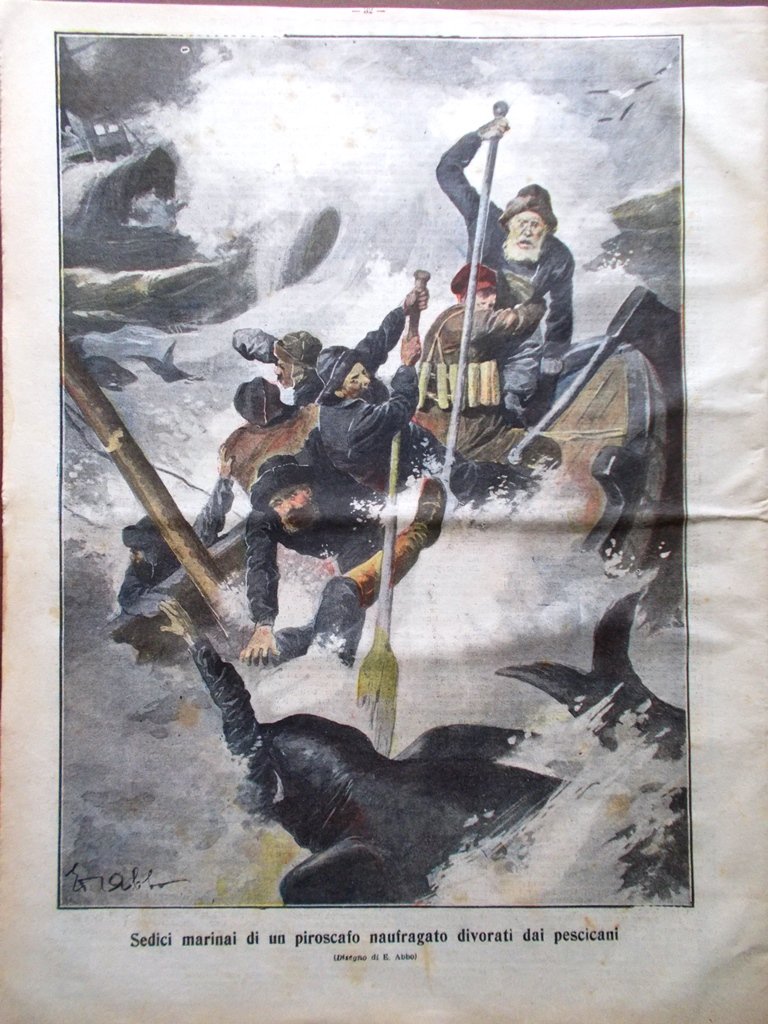 Sedici marinai di un piroscafo naufragato divorati dai pescicani (disegno di E. Abbo)