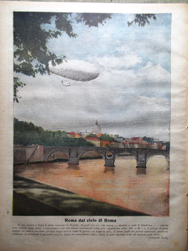 Roma dal cielo di Roma: si sono iniziate le prime escursioni in dirigibile (disegno di A. Minardi)