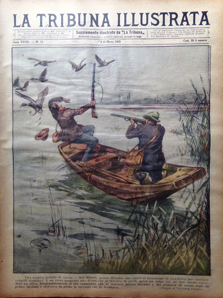 Una tragica partita di caccia. Nel Mincio, presso Rivalta, due amici si trovavano in una barca per cacciare volatili acquatici. A un certo momento uno di essi che si trovava in piedi sparò un colpo cui ne fece succedere un altro freddando però il suo compagno davanti a lui (disegno di Vittorio Pisani)