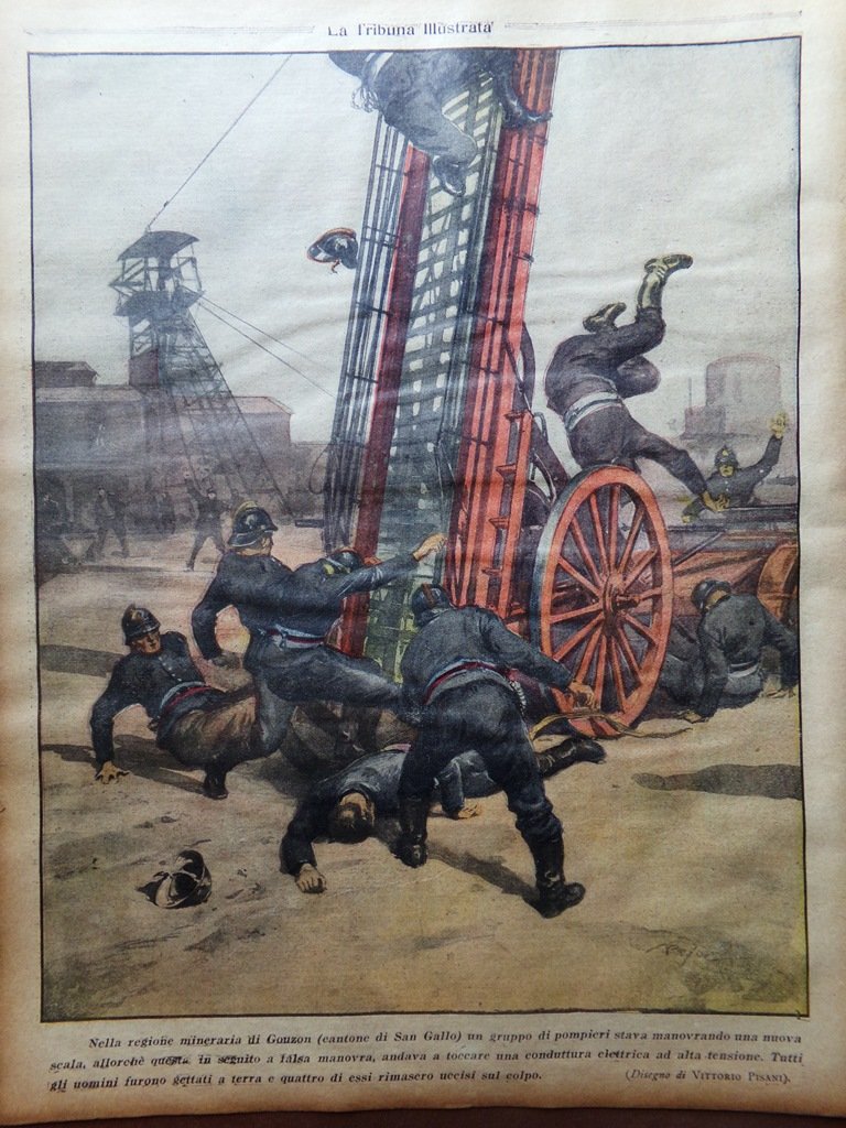 Nella regione mineraria di Gouzon (cantone di San Gallo) un gruppo di pompieri stava manovrando una nuova scala, allorché questa, in seguito a falsa manovra, andava a toccare una conduttura elettrica ad alta tensione. Tutti gli uomini furono gettati a terra e quattro di essi rimasero uccisi sul colpo (disegno di Vittorio Pisani)