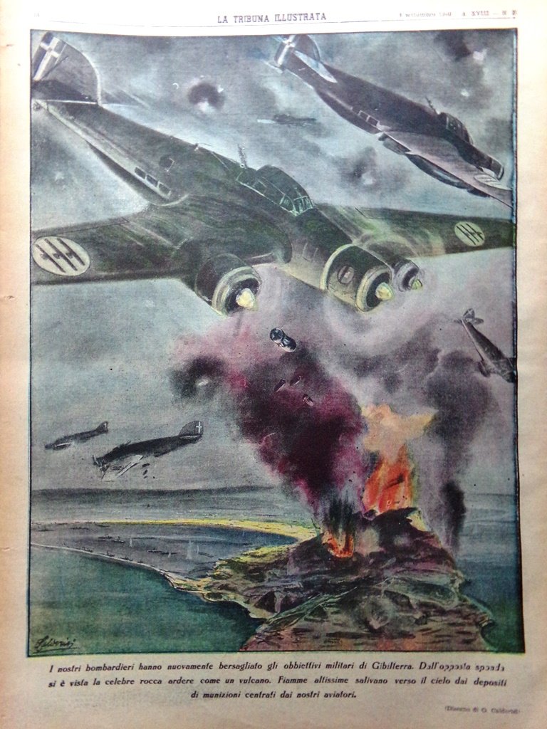 I nostri bombardieri hanno nuovamente bersagliato gli obiettivi militari di Gibilterra. Dall'opposta sponda si è vista la celebre rocca ardere come un vulcano. Fiamme altissime salivano verso il cielo dai depositi di munizioni centrati dai nostri aviatori (disegno di Vittorio Pisani)