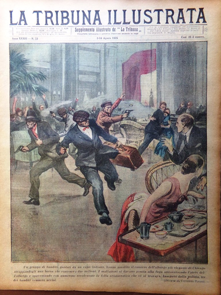 Un gruppo di banditi, guidati da un capo indiano, hanno assalito il cassiere dell'albergo più elegante di Chicago strappandogli una borsa che conteneva due milioni. I malfattori si davano alla fuga ma, inseguiti dalla polizia, tre di loro venivano uccisi (disegno di Vittorio Pisani)