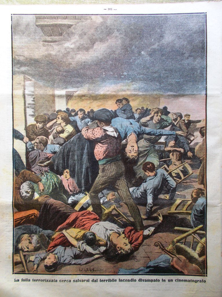 La folla terrorizzata cerca di salvarsi dal terribile incendio divampato in un cinematografo