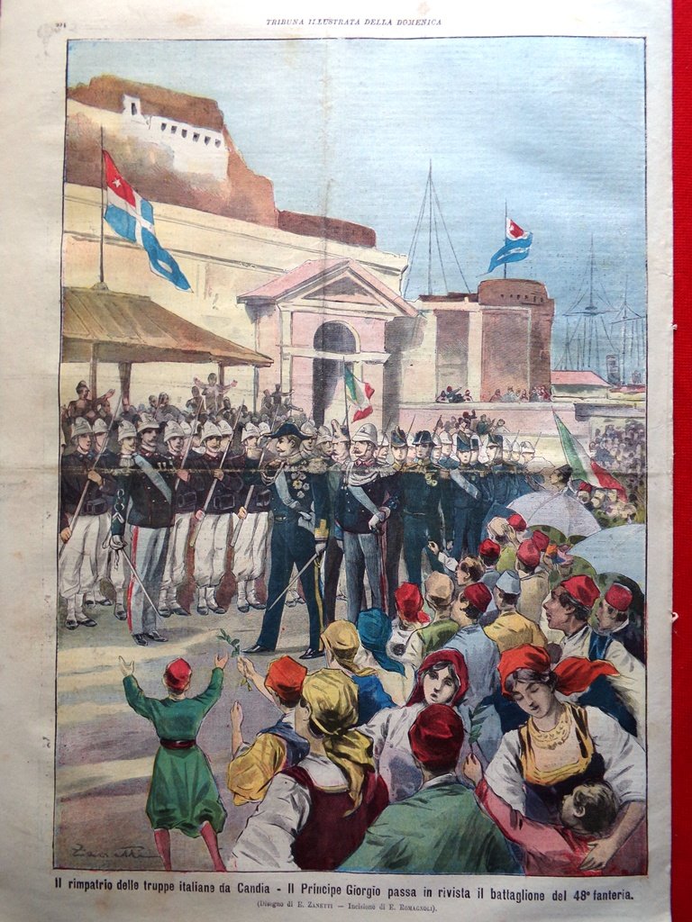 Il rimpatrio delle truppe italiane da Candia: il principe Giorgio passa in rivista il battaglione del 48° fanteria (disegno di E. Zanetti)