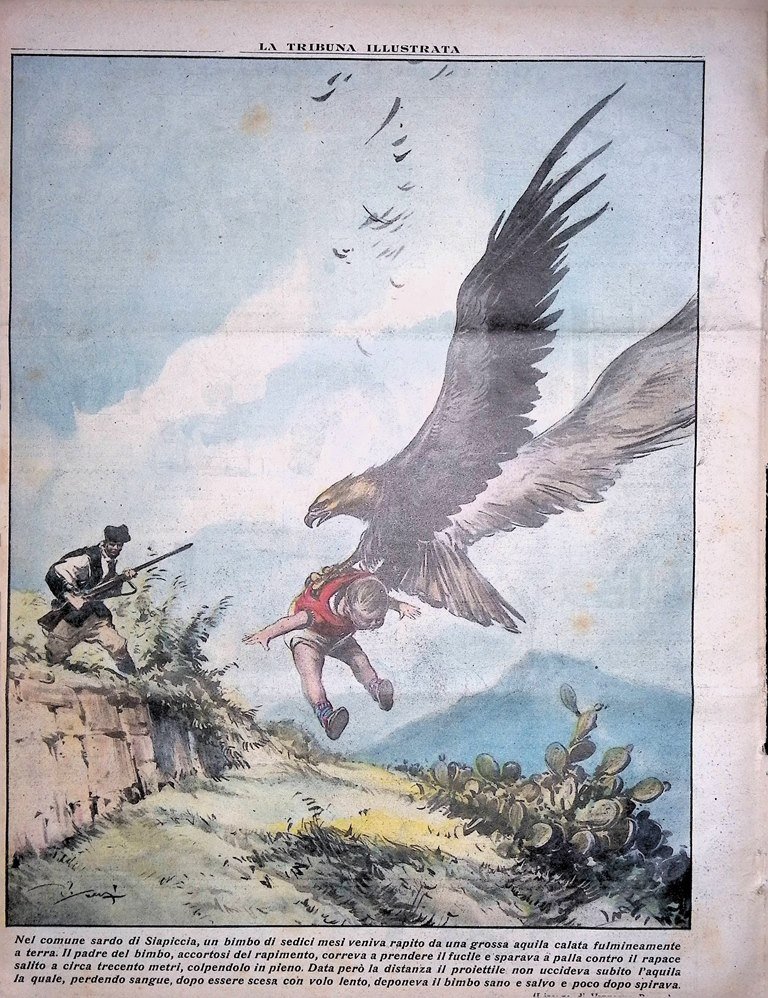 Nel comune sardo di Siapiccia, un bimbo di sedici mesi veniva rapito da una grossa aquila calata fulmineamente a terra. Il padre del bimbo, accortosi del rapimento, correva a prendere il fucile e sparava a palla contro il rapace salito a circa trecento metri colpendolo in pieno. Data però la distanza il proiettile non uccideva subito l'aquila la quale perdendo sangue, dopo essere scesa con volo lento, deponeva il bimbo sano e salvo e poco dopo spirava (disegno di Vittorio Pisani)
