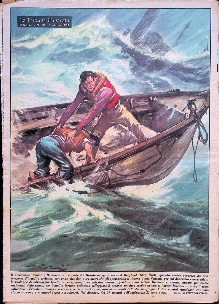 Il mercantile italiano « Bonitas » proveniente dal Brasile navigava verso il Maryland (Stati Uniti) quando veniva sorpreso da una tempesta d'inaudita violenza, con onde alte fino a sei metri che gli spezzavano il timone e una fiancata, per cui dovevano essere calate le scialuppe di salvataggio. Quella in cui si erano imbarcati due marinai affondava quasi subito. Ma mentre, esausti, stavano per essere inghiottiti dalle acque, per inaudita fortuna vedevano galleggiare lì accanto un'altra scialuppa vuota: l'aveva lanciata in mare il transatlantico « President Adams » accorso con altre navi in risposta ai disperati SOS dei naufraghi. I due uomini riuscivano con uno sforzo supremo a montarvi sopra e a salvarsi. Nel disastro, dei 27 uomini dell'equipaggio 22 sono periti.