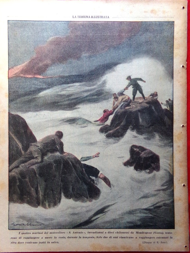 I quattro marinai del motoveliero S. Antonio incendiatosi a 10 km da Mondragone (Gaeta) tentarono di raggiungere a nuoto la costa durante la tempesta. Solo due di essi riuscirono a salvarsi (disegno di E. Asso)